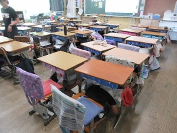 今日は、朝の時間を利用して、緊急地震速報が流れた際の避難行動について全クラスで訓練を実施しました。どのクラスも、①低い姿勢をとる、➁頭を守る、③動かないことの三つの避難行動を確認することができました。