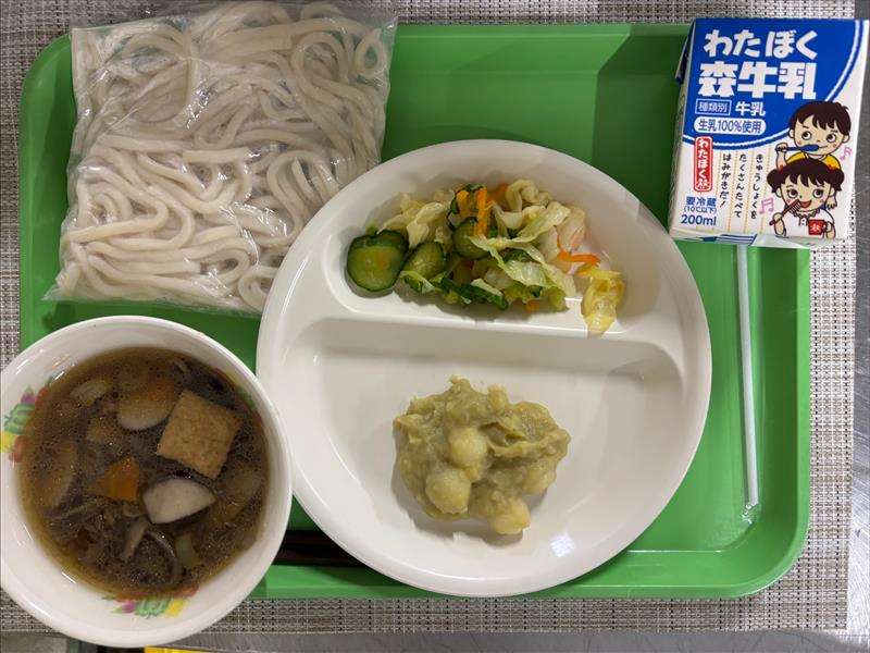 【今日の献立】 おっきりこみうどん・かおりづけ・スイートポテトしらたま・牛乳