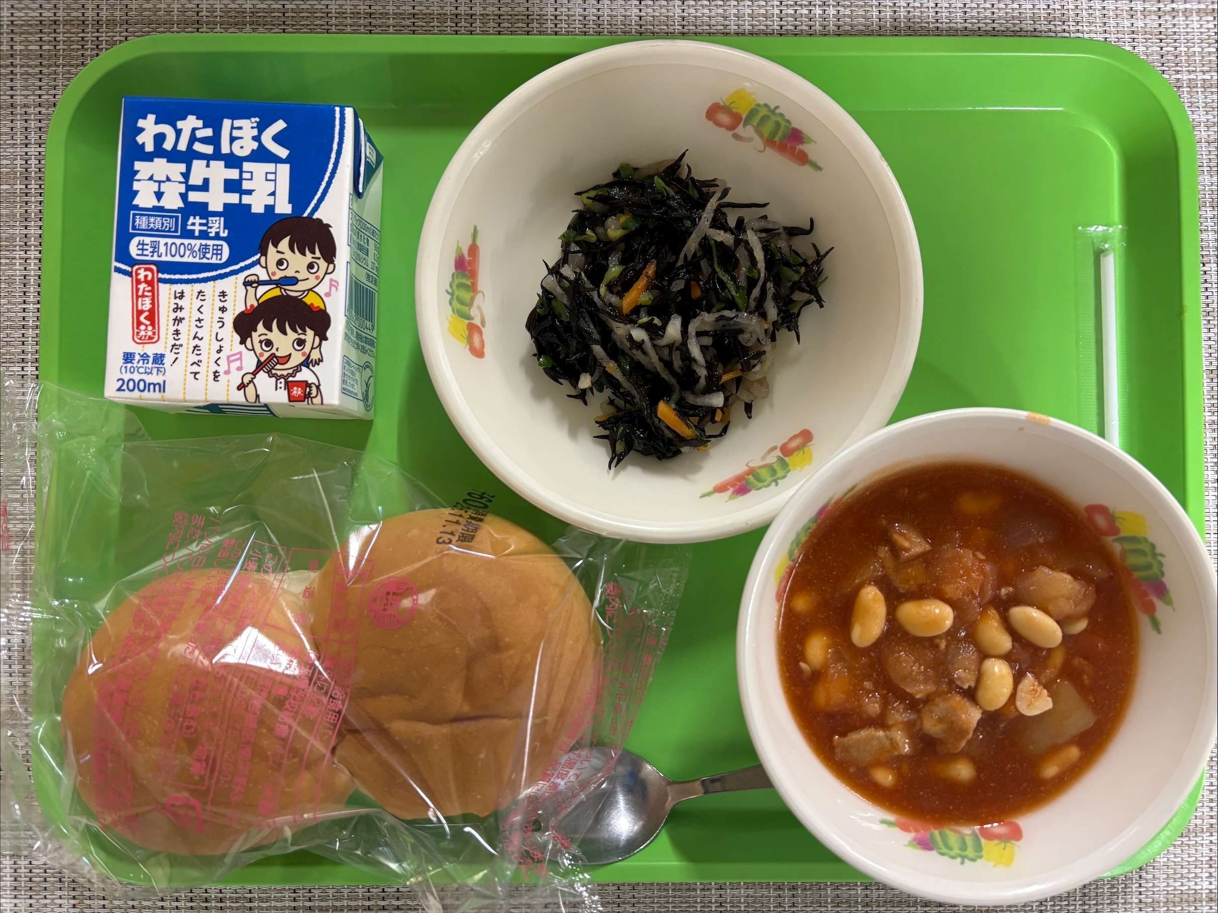 こどもパン・ポークビーンズ・ひじきのマリネ・牛乳