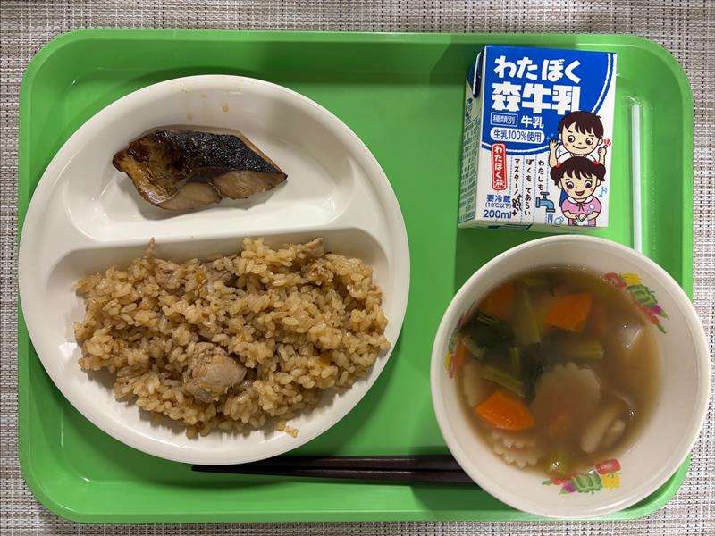 【今日の献立】 東松山やきとりごはん・あじのてりやき・まゆたまじる・牛乳