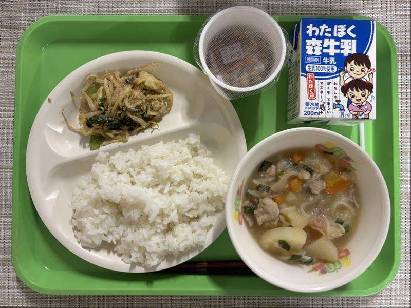 今日は埼玉県産の大豆を使った納豆でした。給食で提供する彩の国納豆は、粒が大きいため、豆の味がしっかりと感じられます。また、ごま酢和えに使ったこまつなは、さいたま市の農家さんが作ってくださったものです。おいしいこまつなをありがとうございました。