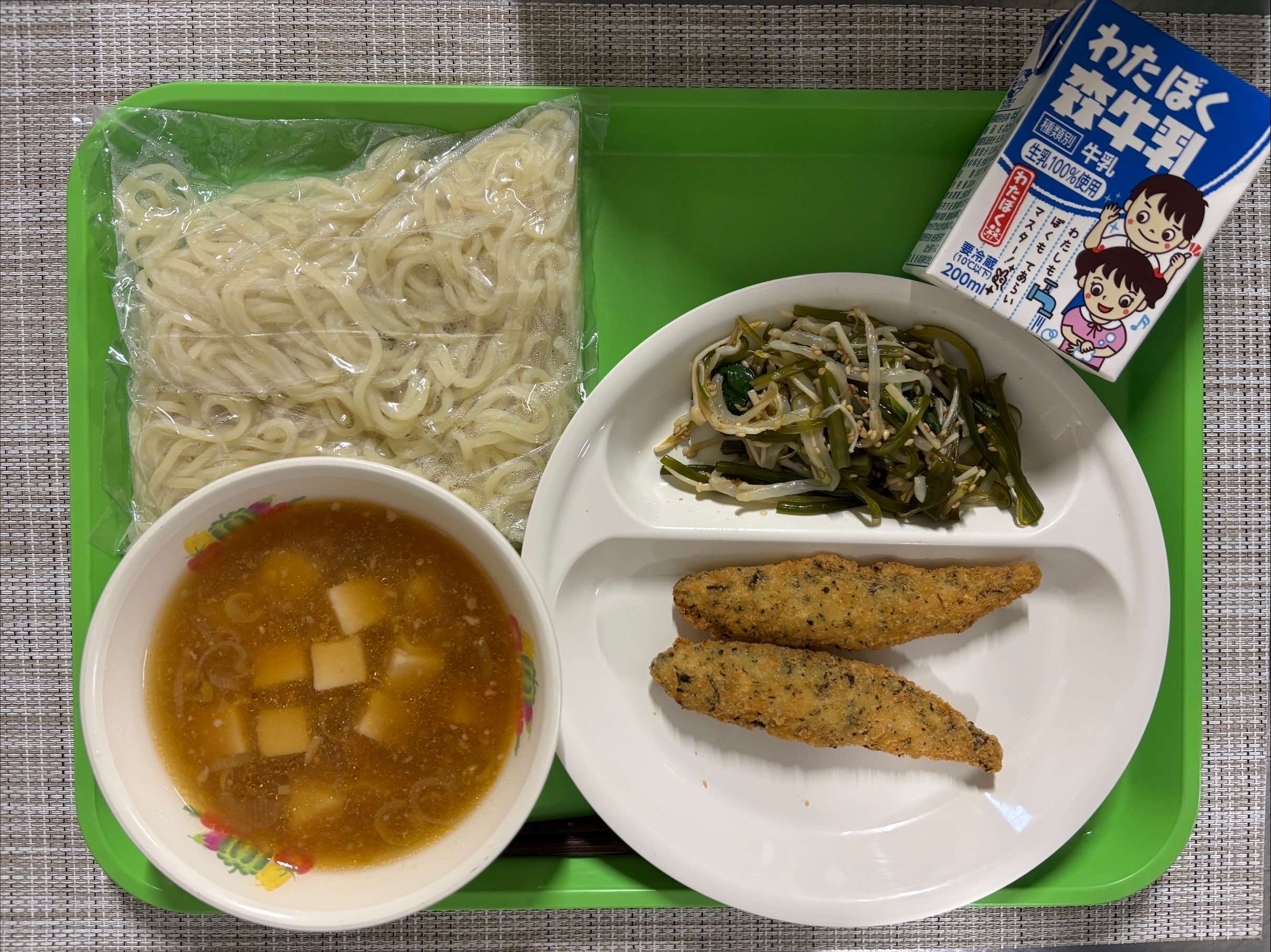 【今日の献立】 岩槻豆腐ラーメン・小いわしの狭山茶フライ・茎わかめのチョナムル・牛乳