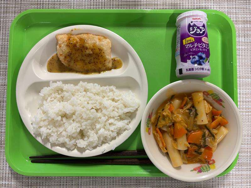 今日は韓国料理給食でした。ハニーマスタードチキンに、チーズトッポギでした。韓国料理は辛いのが特徴なので、少しだけ辛さを残して仕上げました。辛さを感じながらも、おいしく食べてくれたかな?