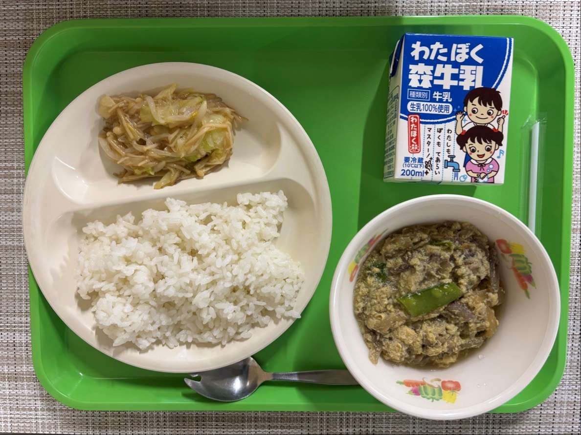 【今日の献立】 ごはん・柳川風丼・なめたけ和え・牛乳