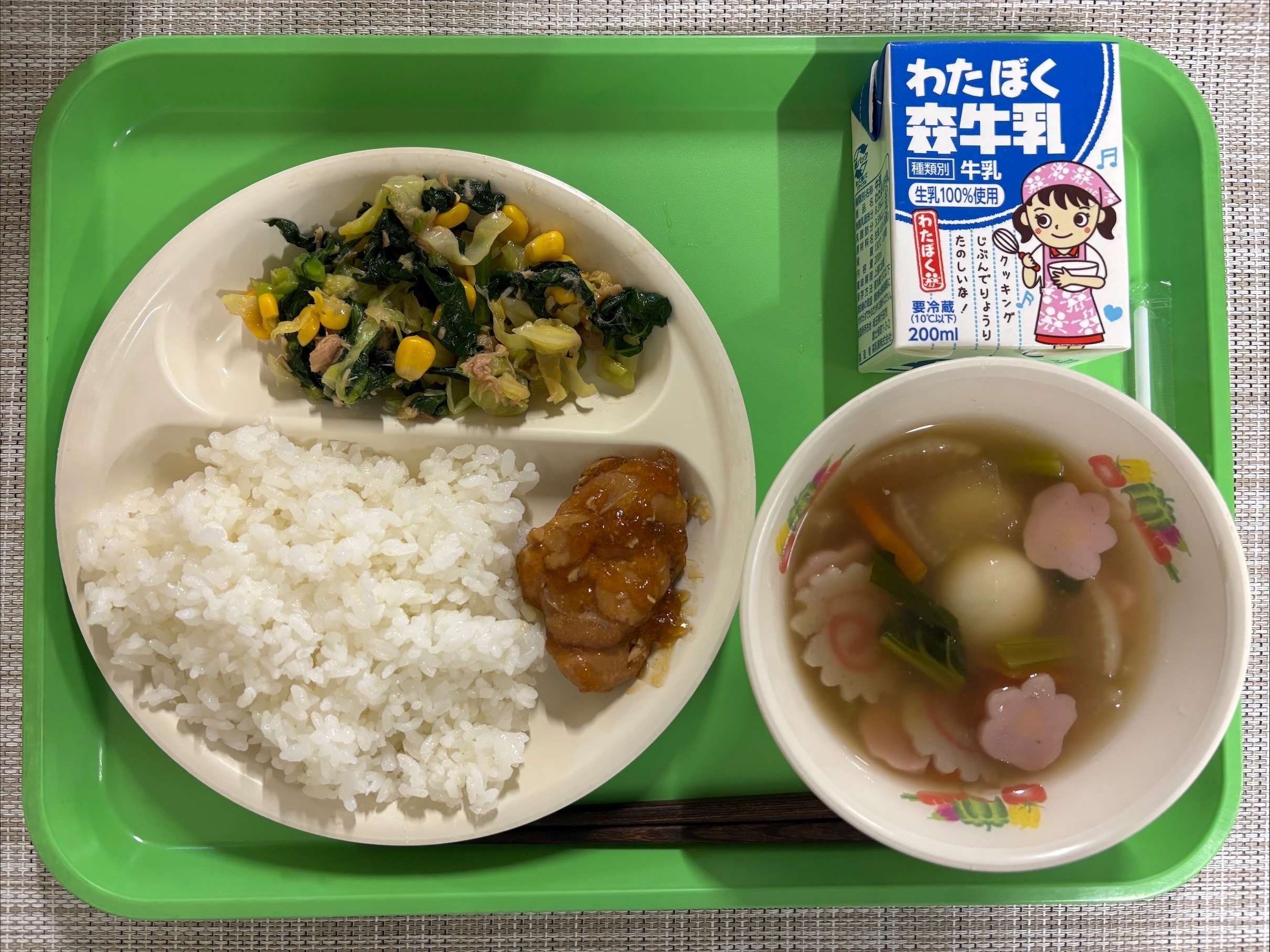 【今日の献立】 ごはん・照り焼きチキン・お雑煮・小松菜のツナ和え・牛乳