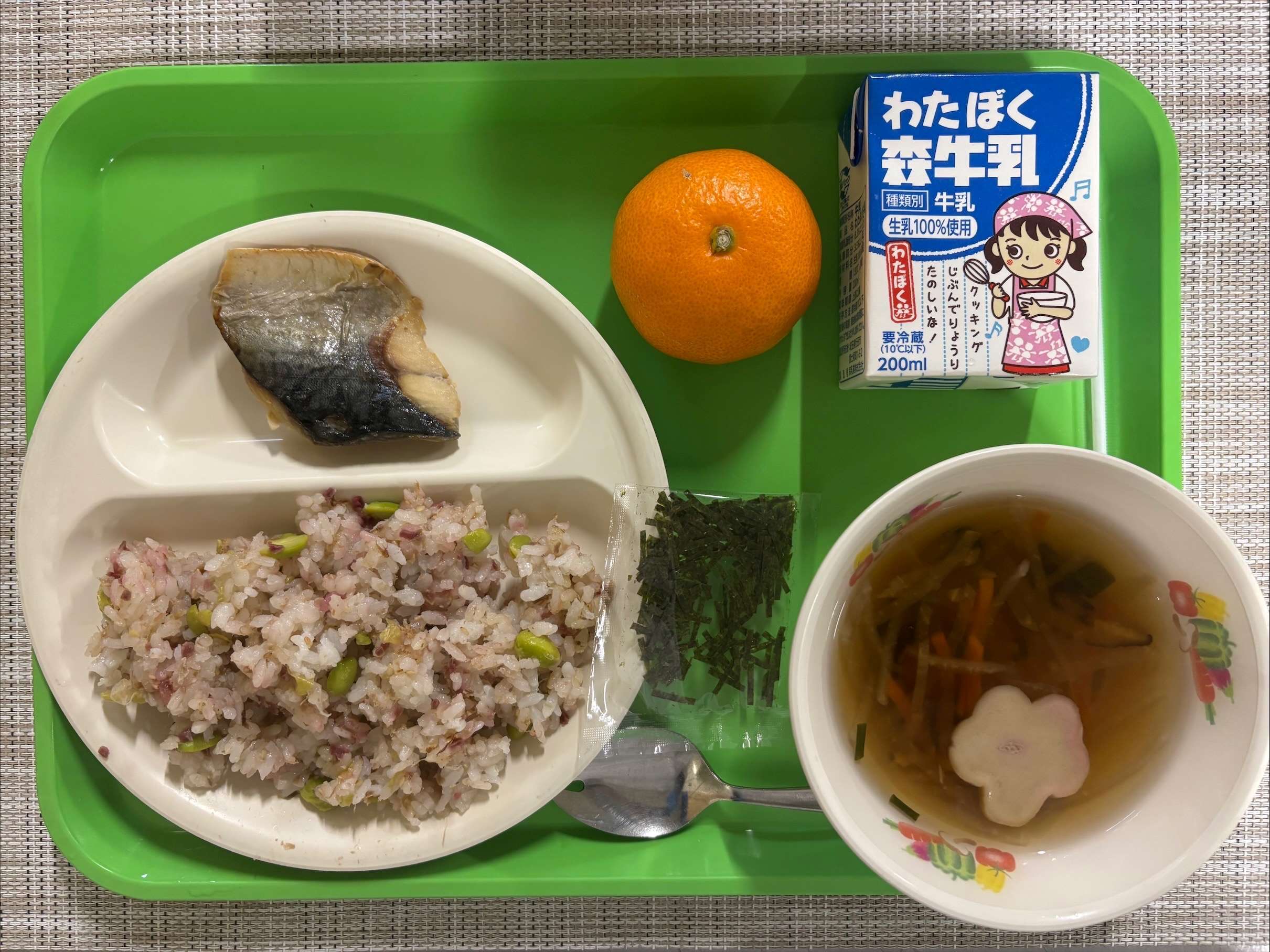 【今日の献立】 おかかと梅ごはん・さばの塩焼き・だしがきいたあったかスープ・みかん・牛乳