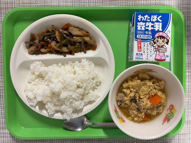 【今日の献立】 おやこどん・ピーマンとちくわのきんぴら・牛乳