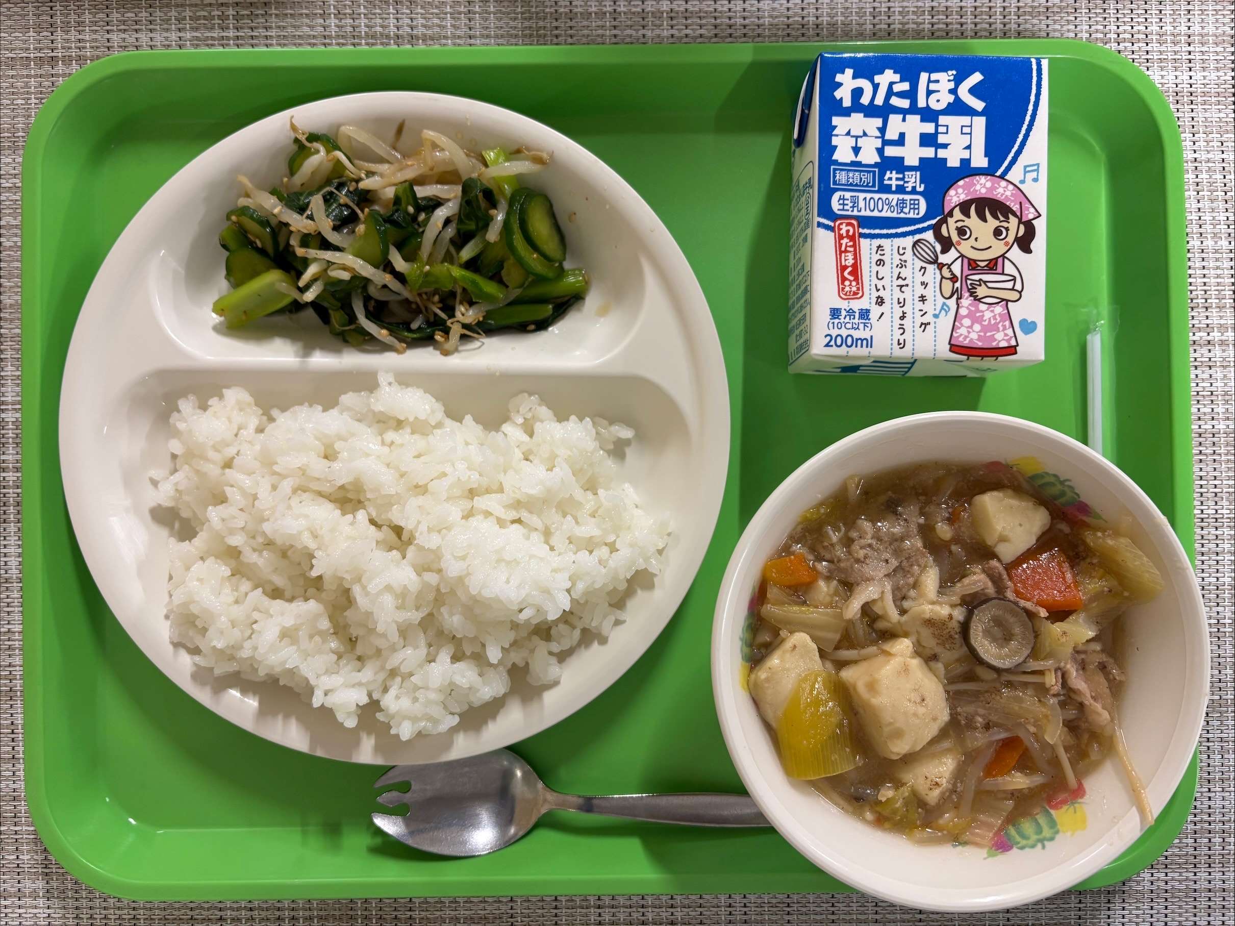 【今日の献立】 ごはん・おいしすぎ!ぶたすきやき・もやしのナムル・牛乳