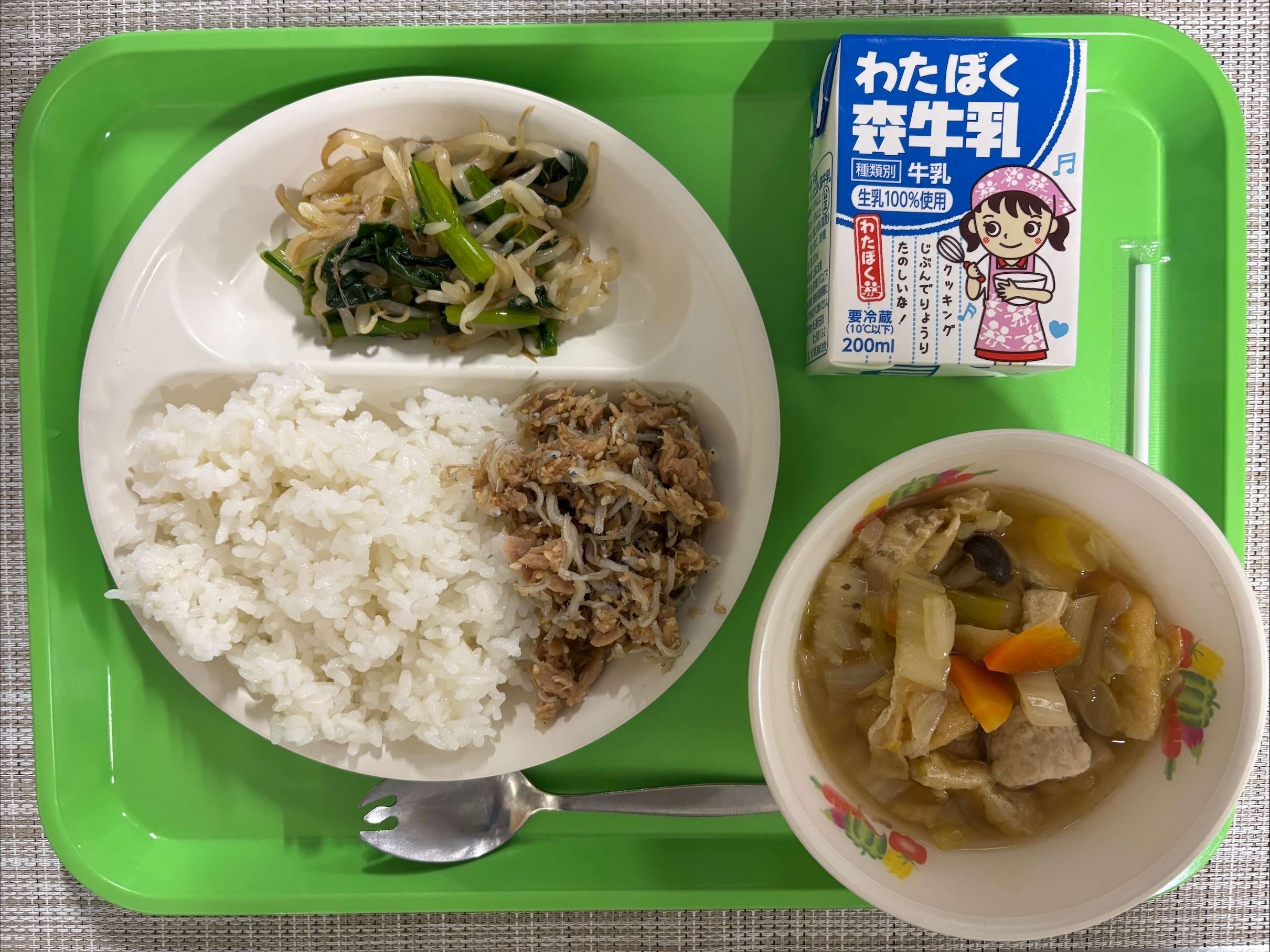 【今日の献立】 ツナじゃこごはん・野菜たっぷりちゃんこ汁・こまつなののお浸し・牛乳