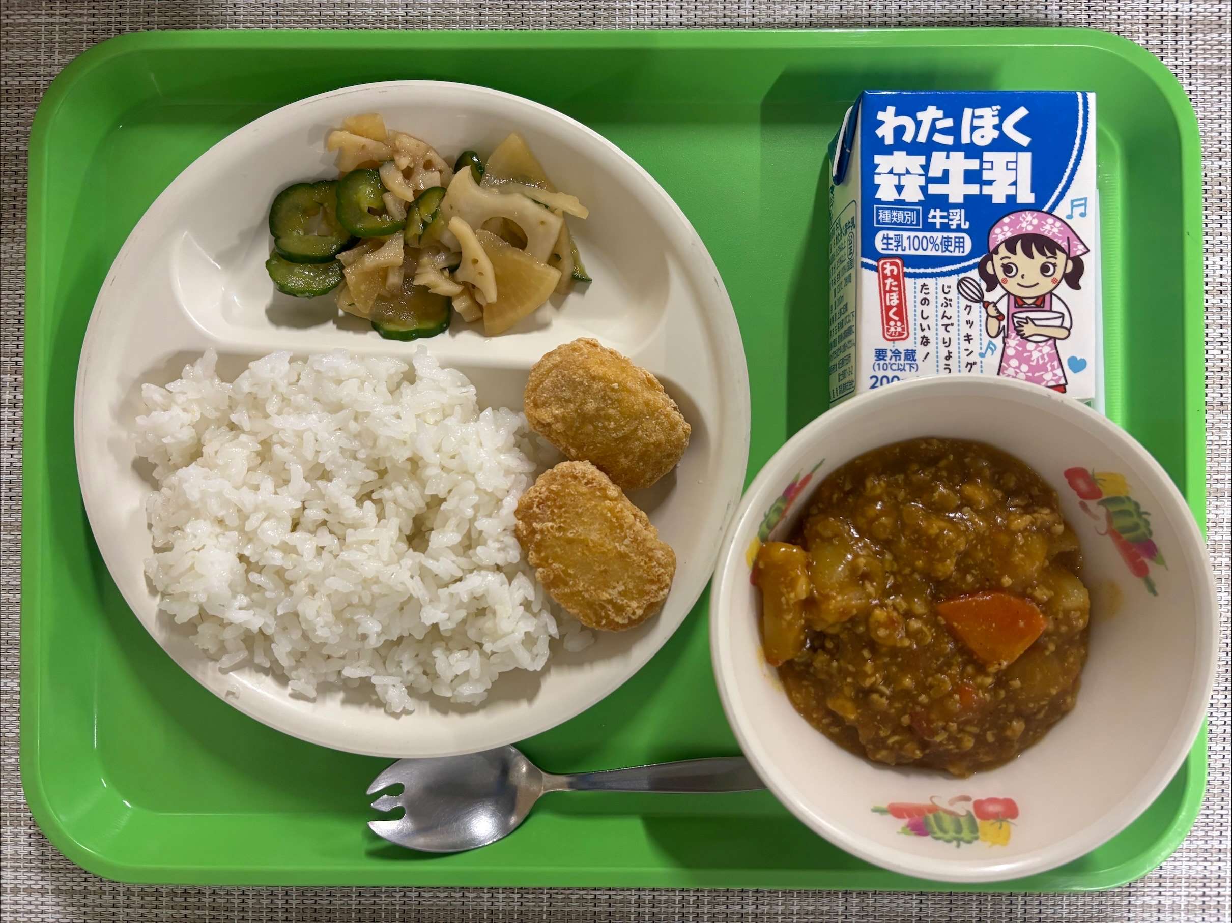 ごはん・なかよしカレー・チキンナゲット・手作り福神漬け・牛乳