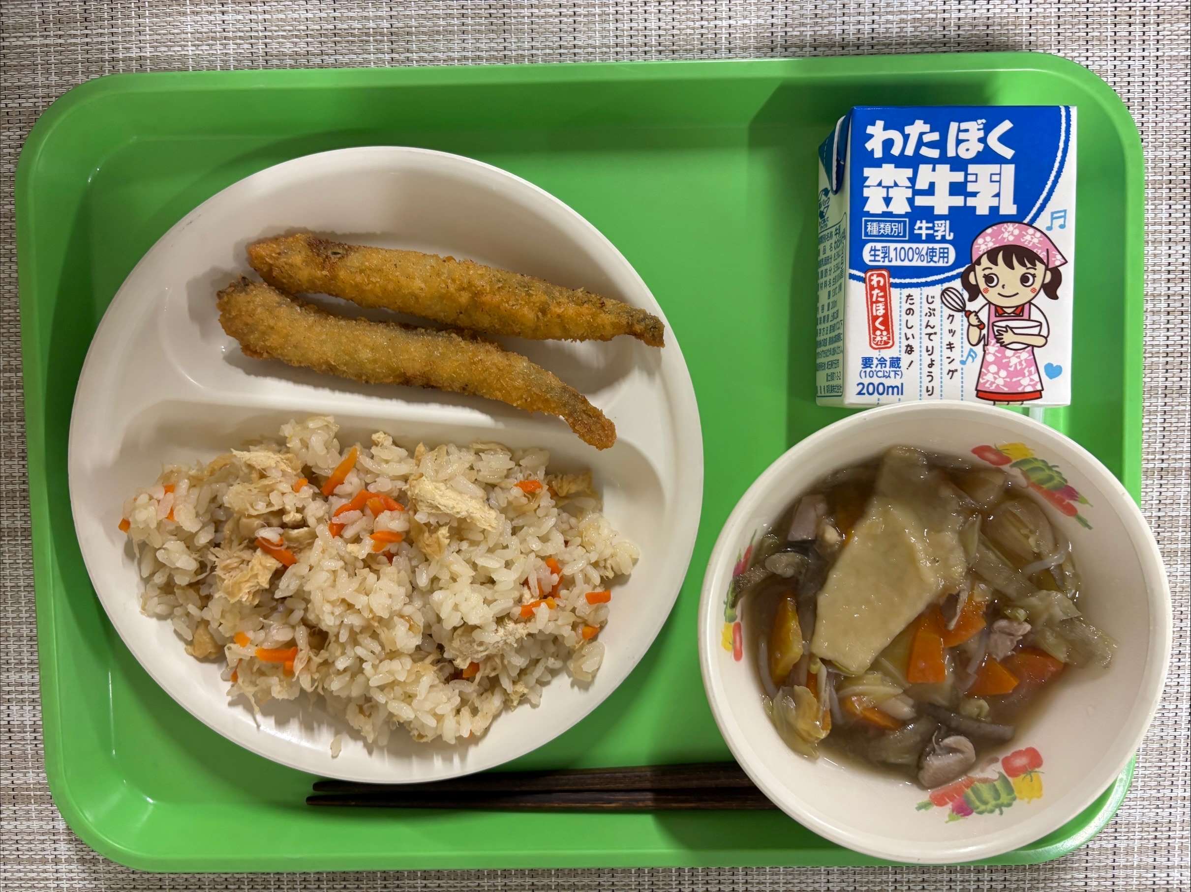 【今日の献立】 ほたてごはん・ししゃもフライ・せんべいじる・牛乳