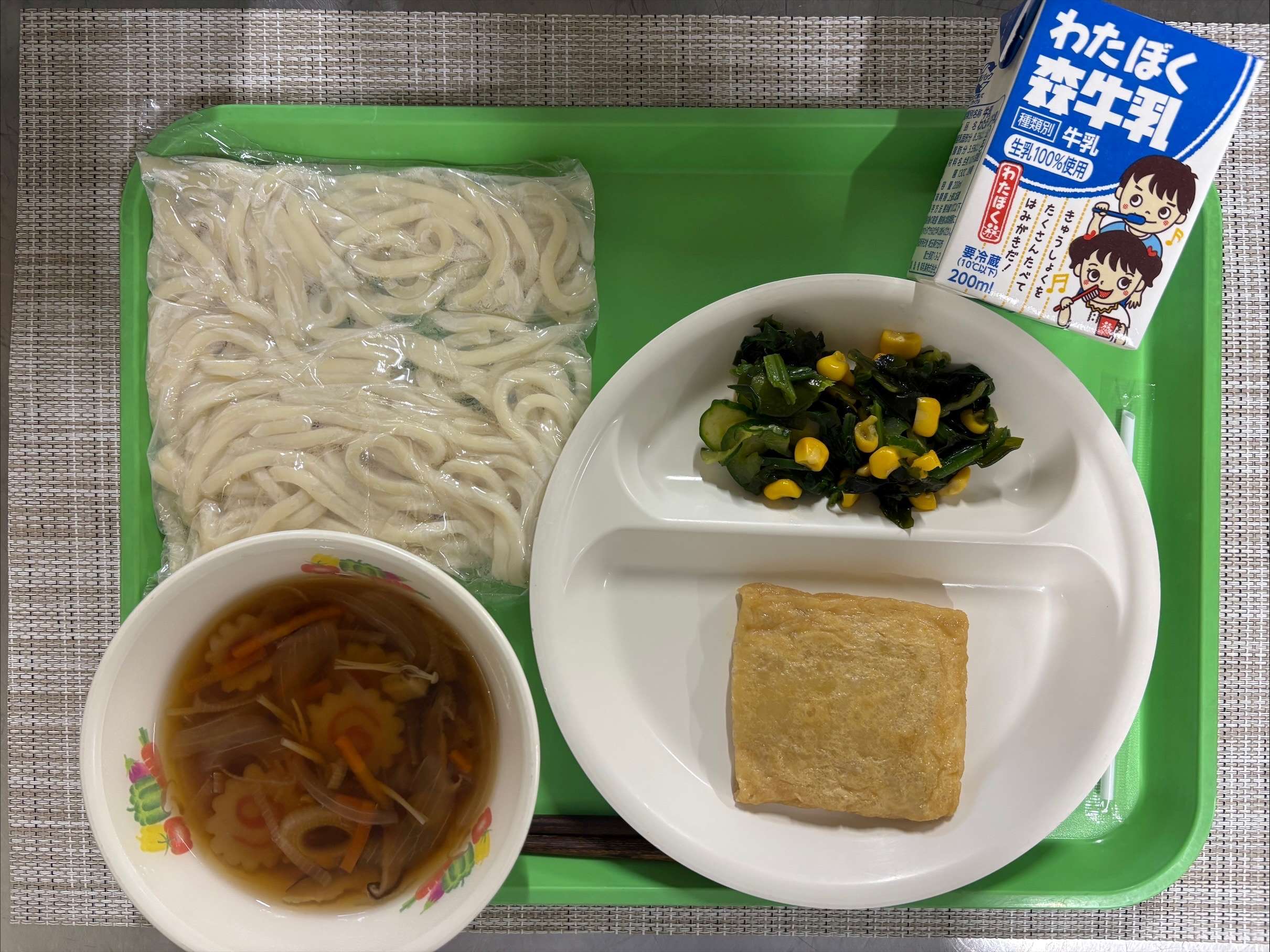 【今日の献立】 きつねうどん・きつねもち・ほうれんそうとわかめの和え物・牛乳