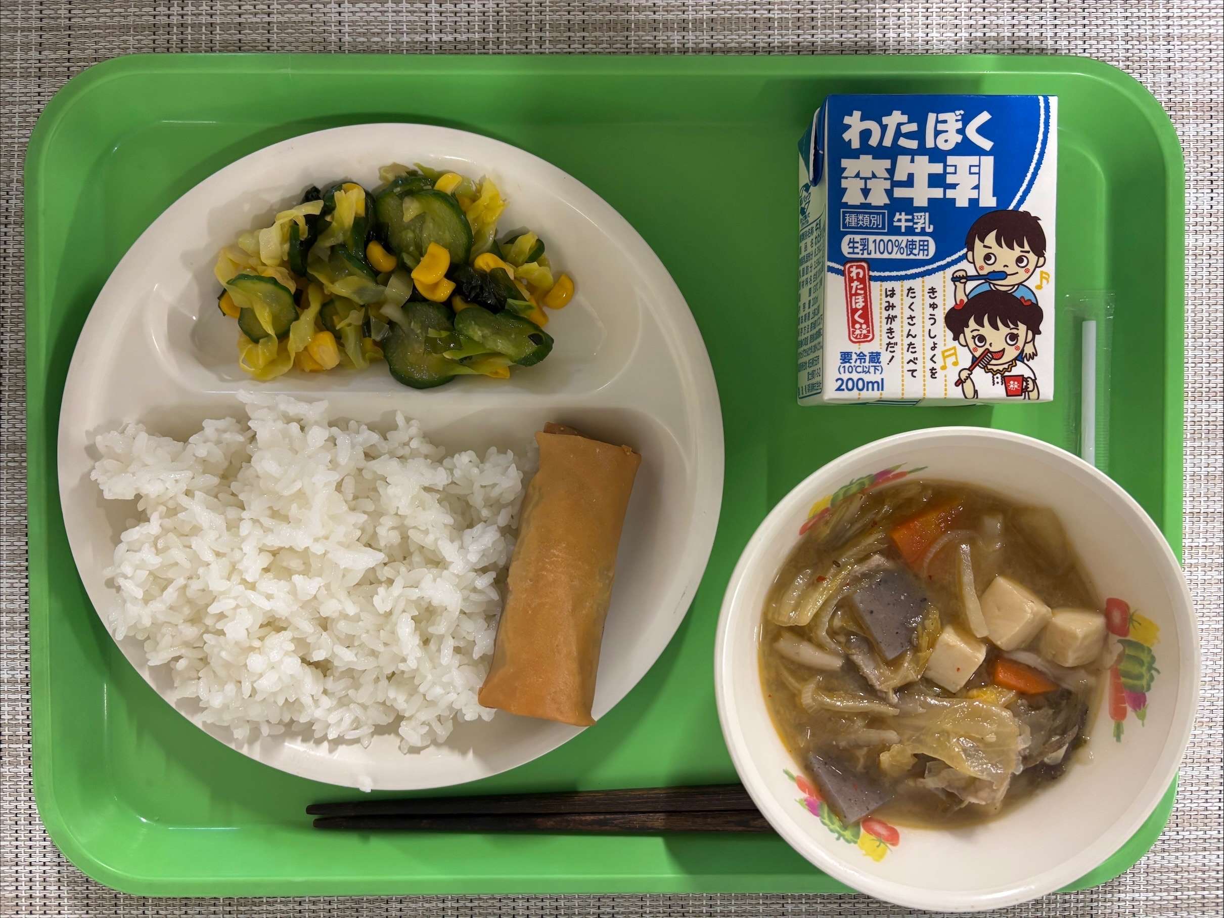 ごはん・春巻き・ごまキムチ汁・わかめサラダ・牛乳