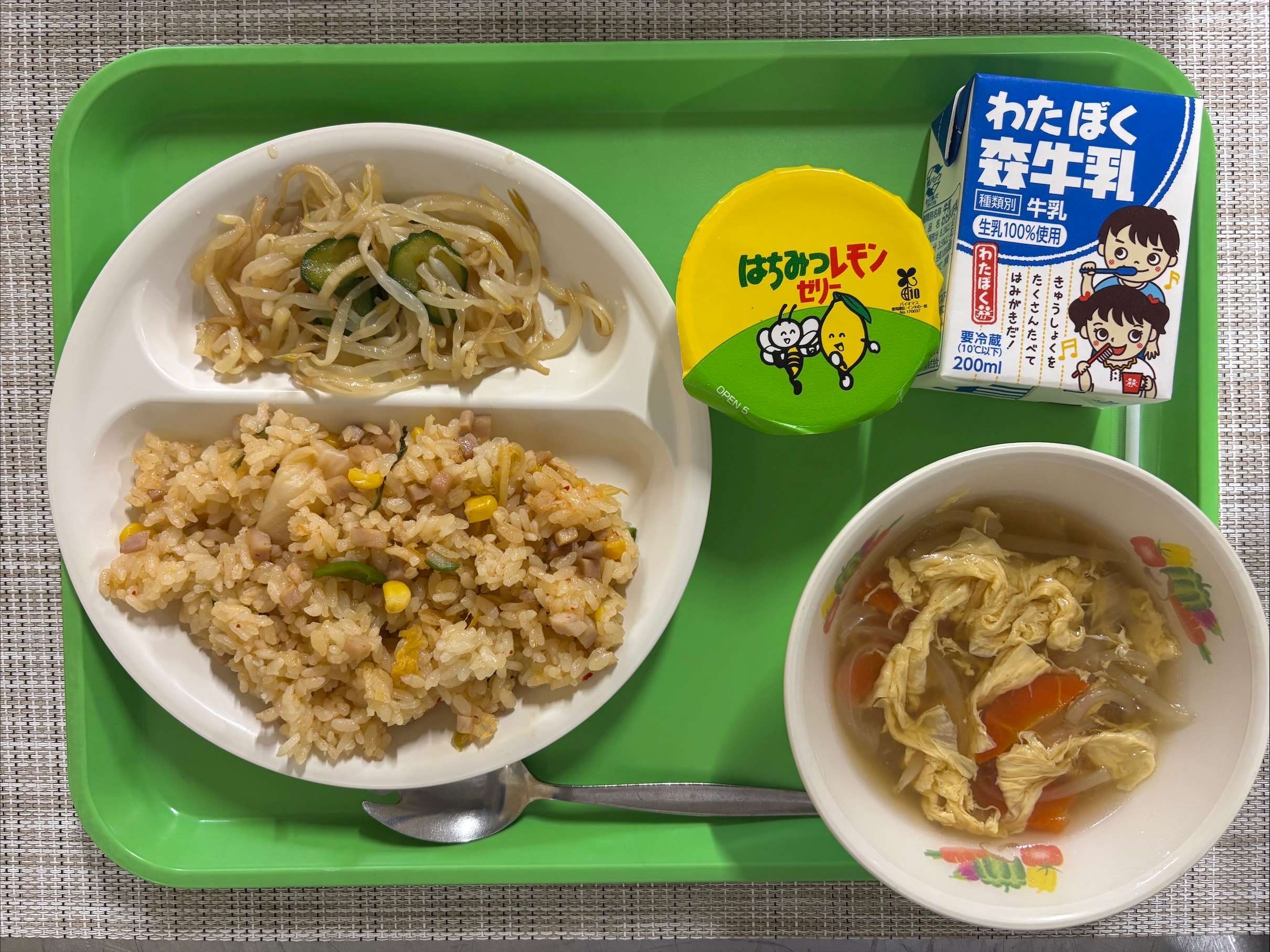 キムチチャーハン・たまごスープ・もやしのナムル・はちみつレモンゼリー・牛乳