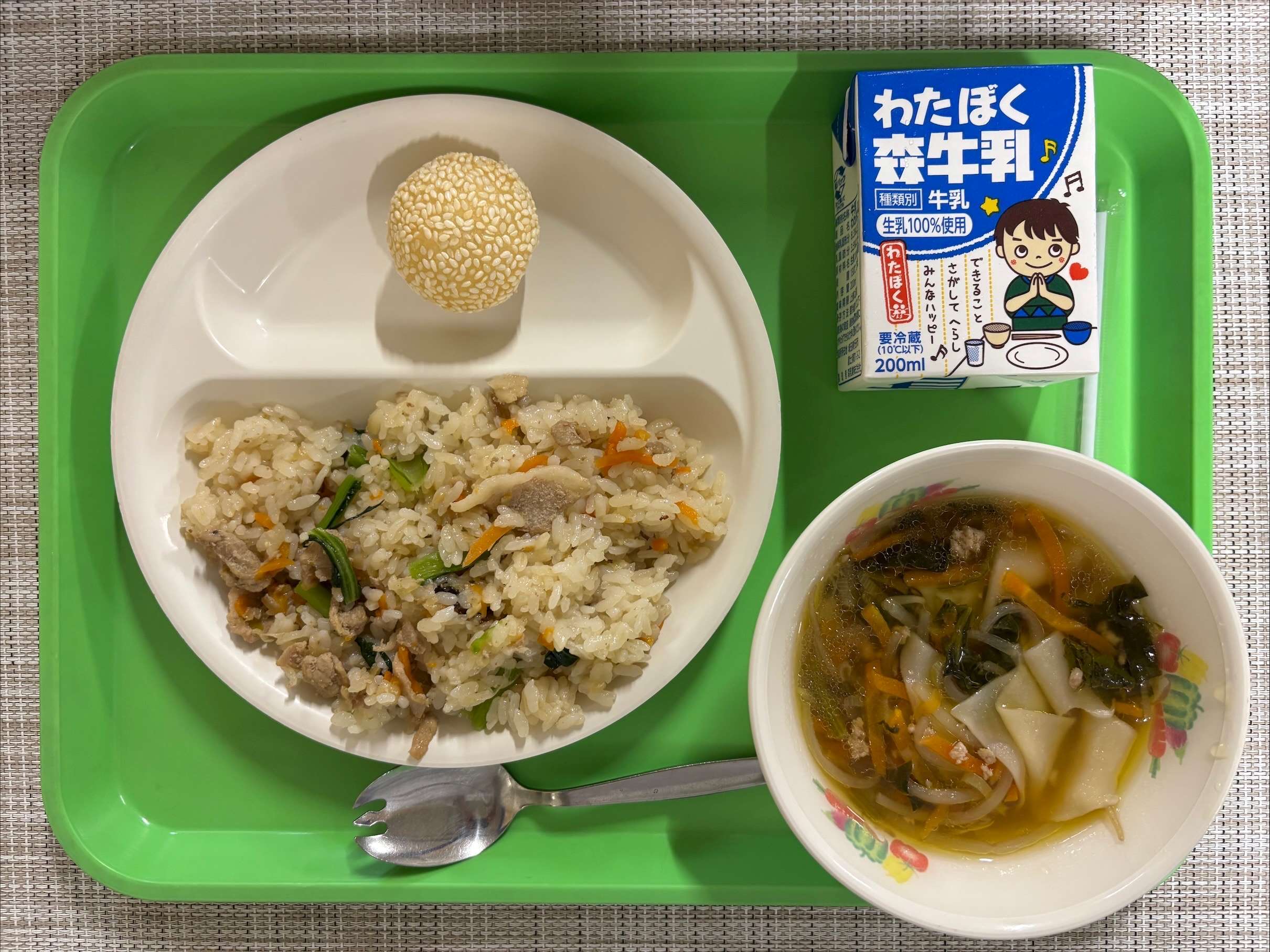 【今日の献立】 やきにくチャーハン・ごまだんご・ワンタンスープ・牛乳