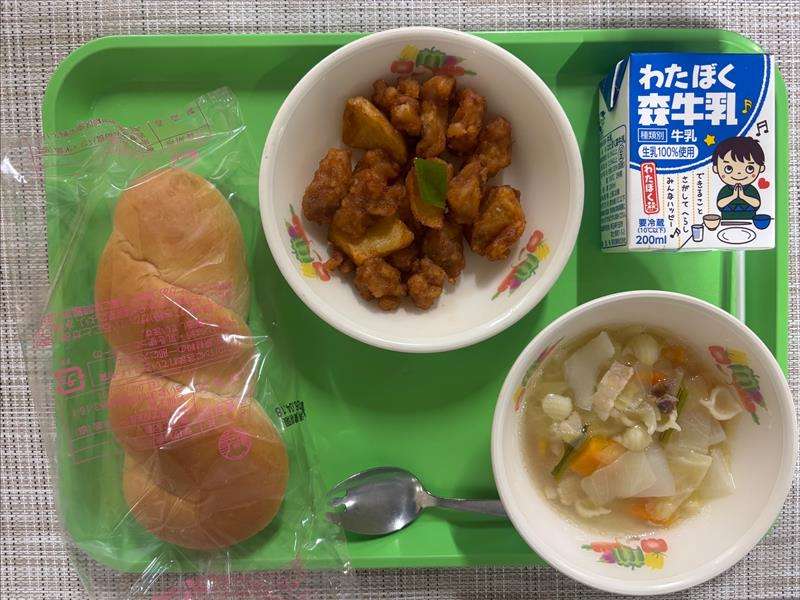 【今日の献立】 ツイストパン・チキンとポテトのケチャップあえ・マカロニスープ・牛乳