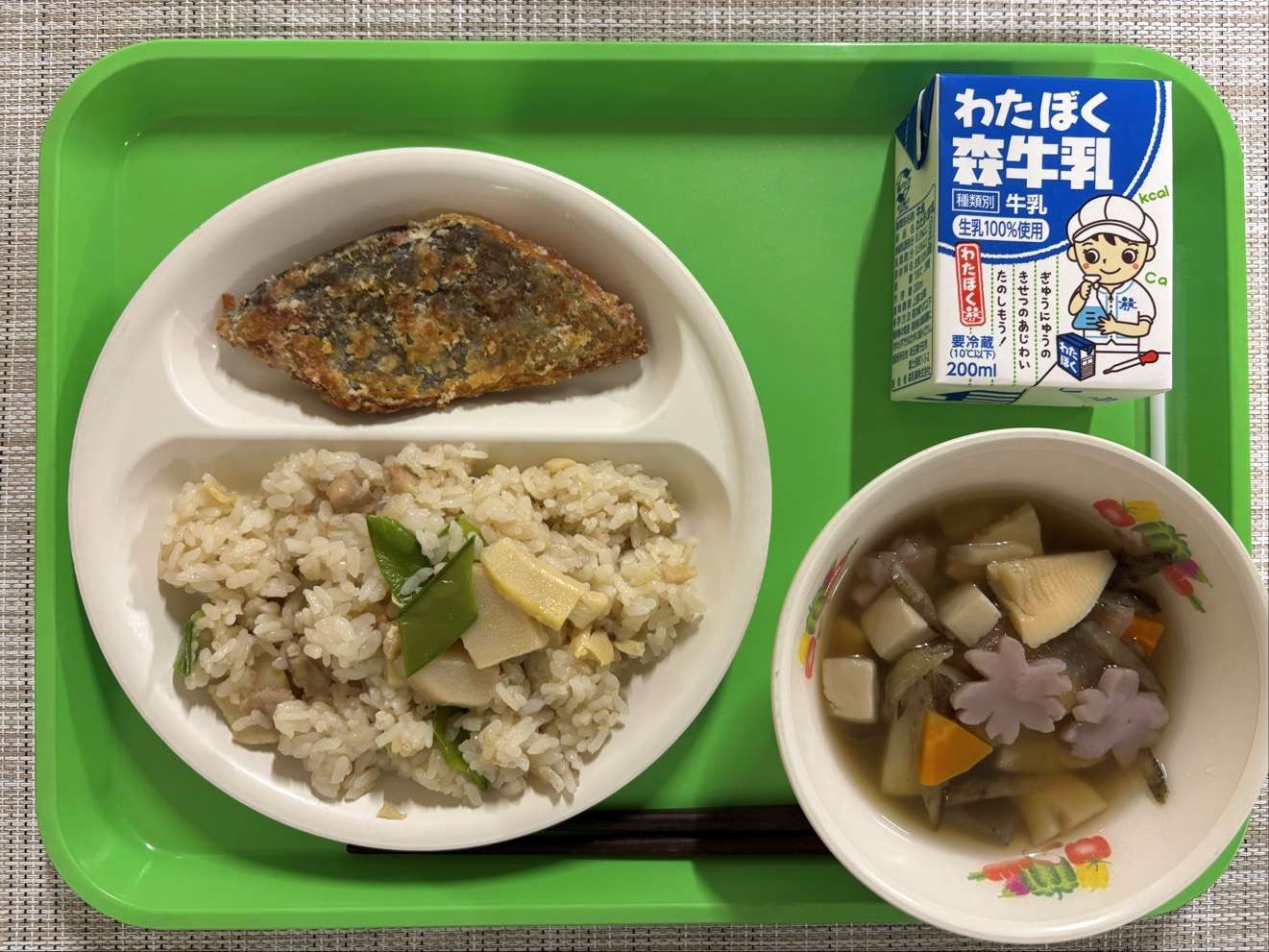 【今日の献立】 たけのこごはん・さわらの立田揚げ・春野菜のけんちん汁・牛乳
