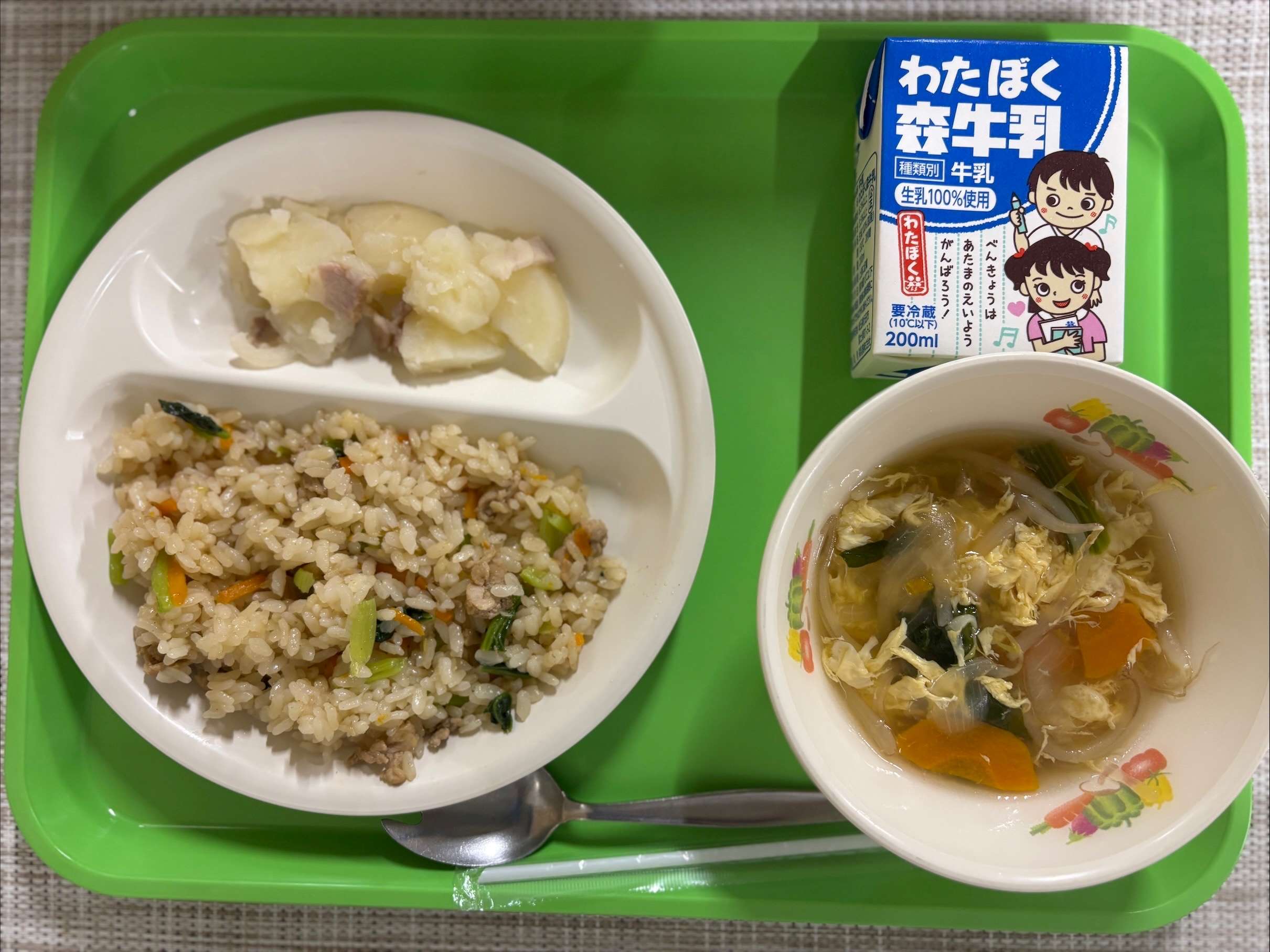【今日の献立】 やきにくチャーハン・ジャーマンポテト・ちゅうかたまごスープ・牛乳
