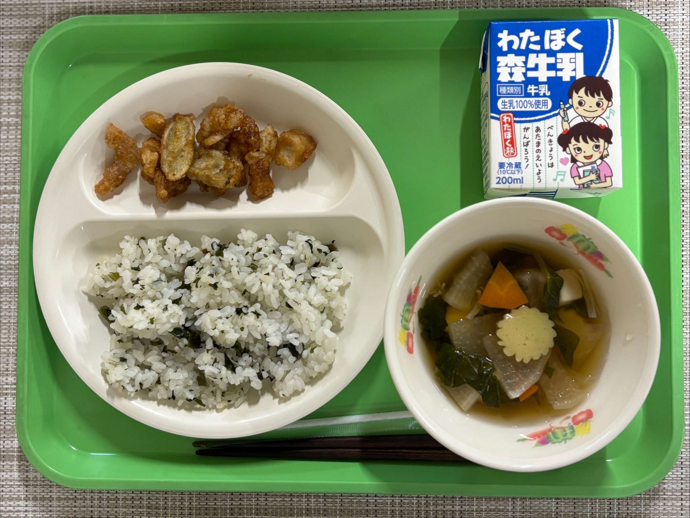 【今日の献立】 わかめごはん・チキンチキンごぼう・すまし汁・牛乳