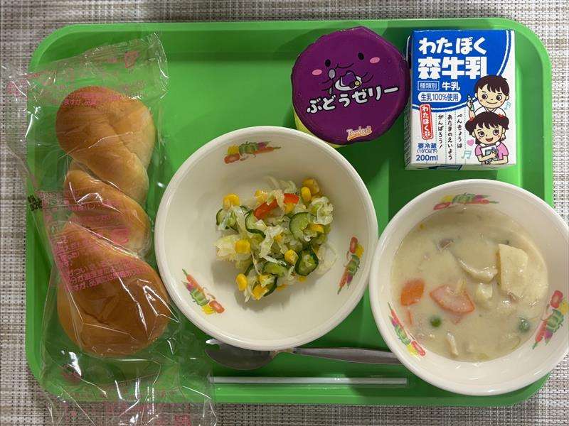 今日の献立】 ツイストパン・クリームシチュー・コールスローサラダ・ぶどうゼリー・牛乳