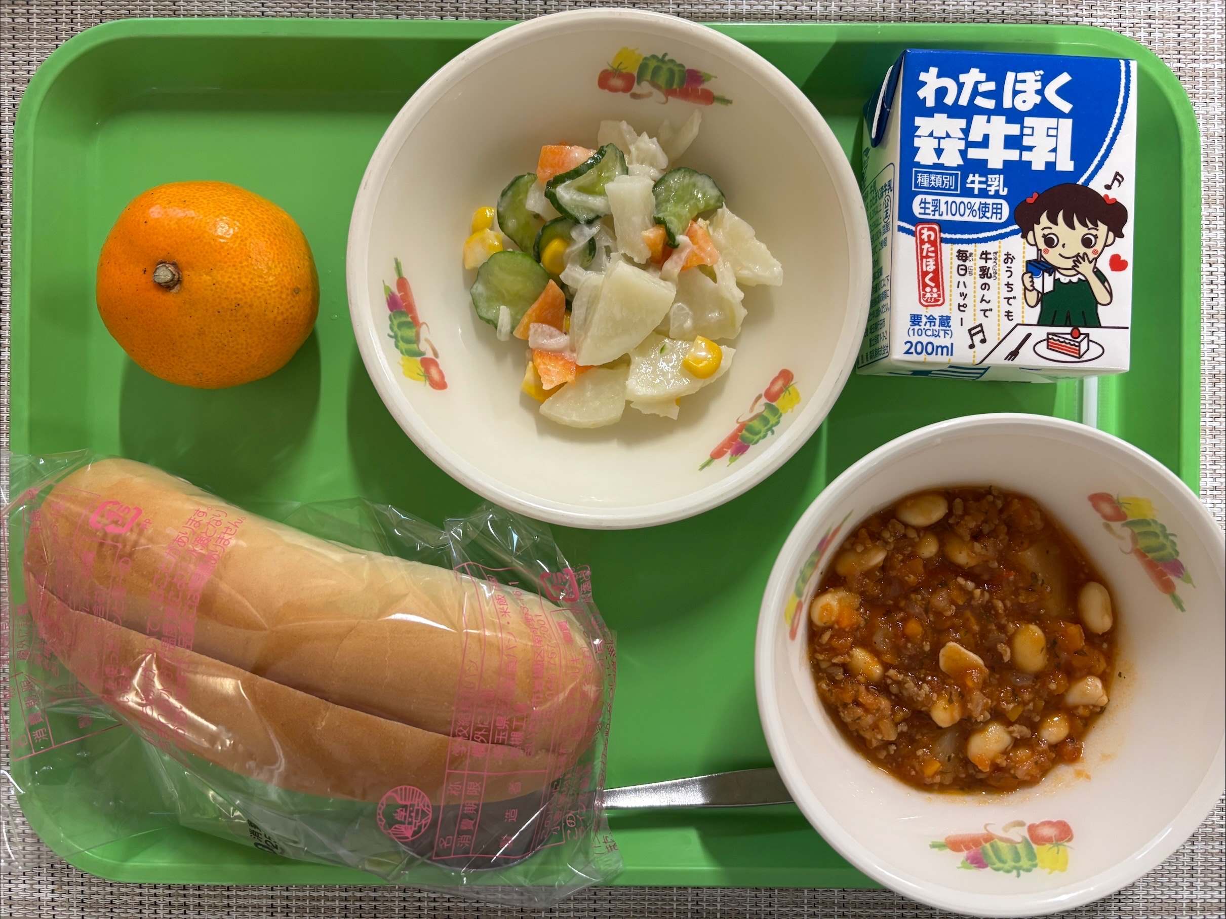 【今日の献立】 コッペパン・チリコンカン・ポテトサラダ・みかん・牛乳