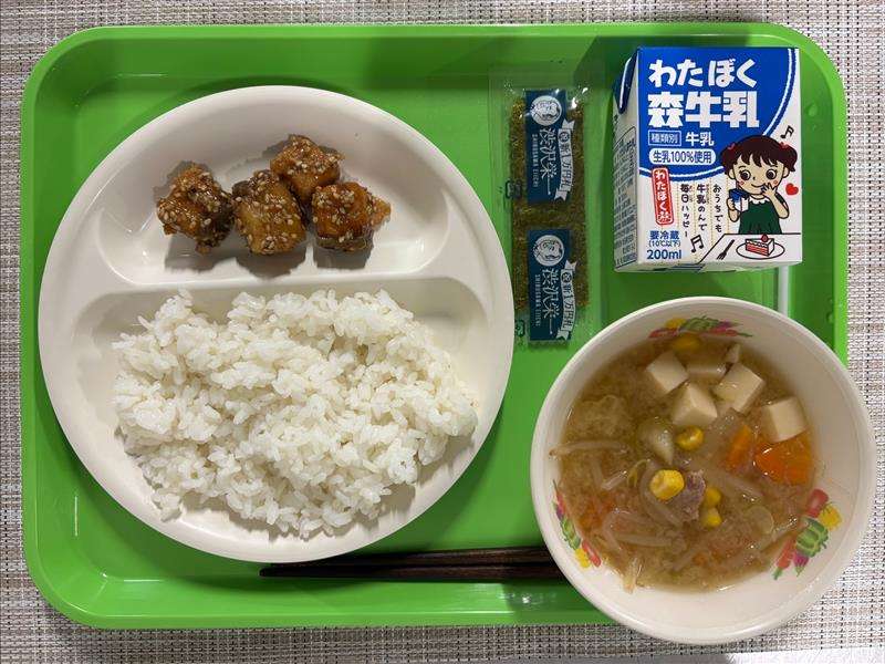 【今日の献立】 ごはん・あじつけのり・さけザンギ・どさんこじる・牛乳