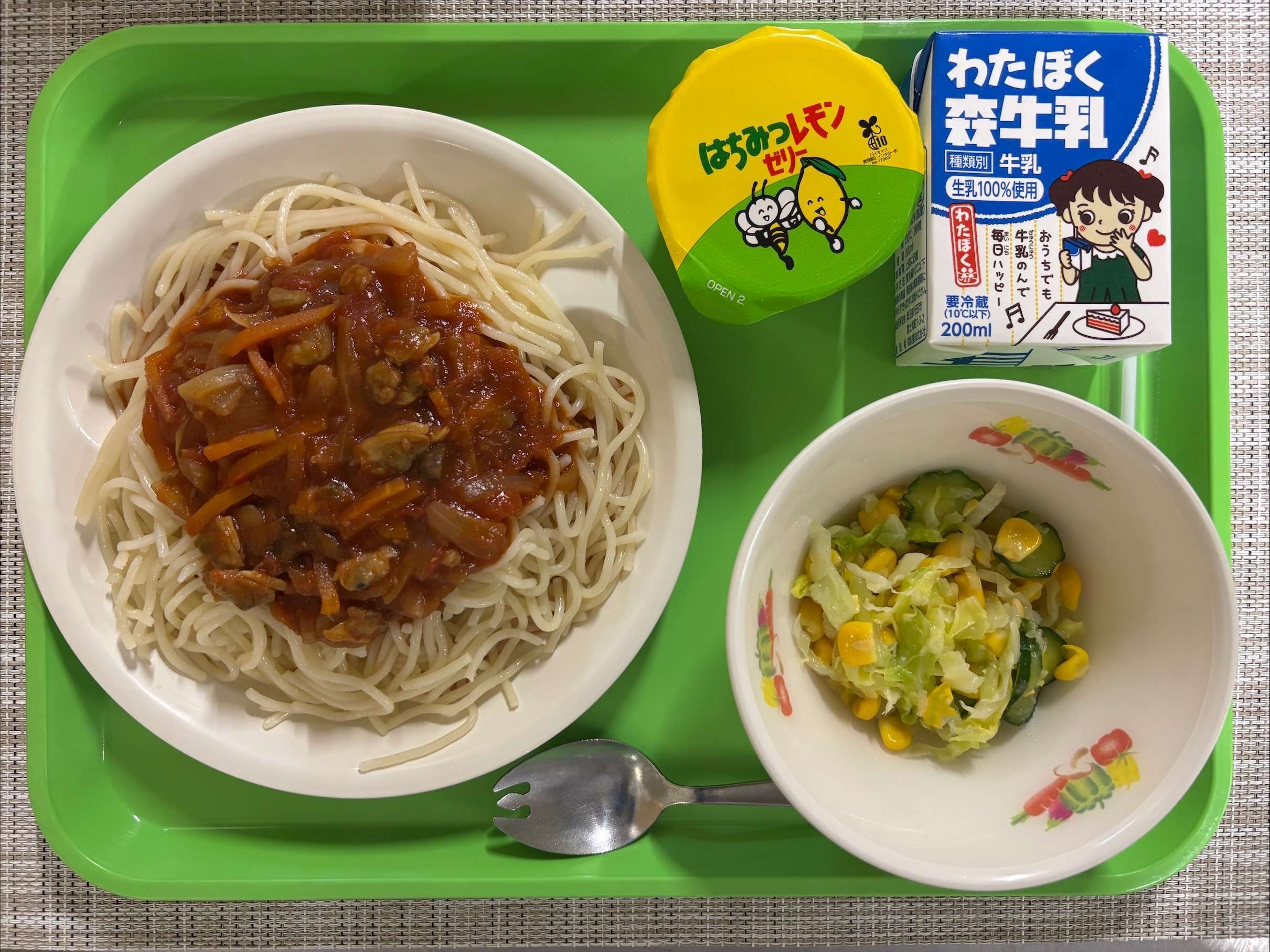 【今日の献立】 シーフードスパゲッティ・コーンサラダ・はちみつレモンゼリー・牛乳