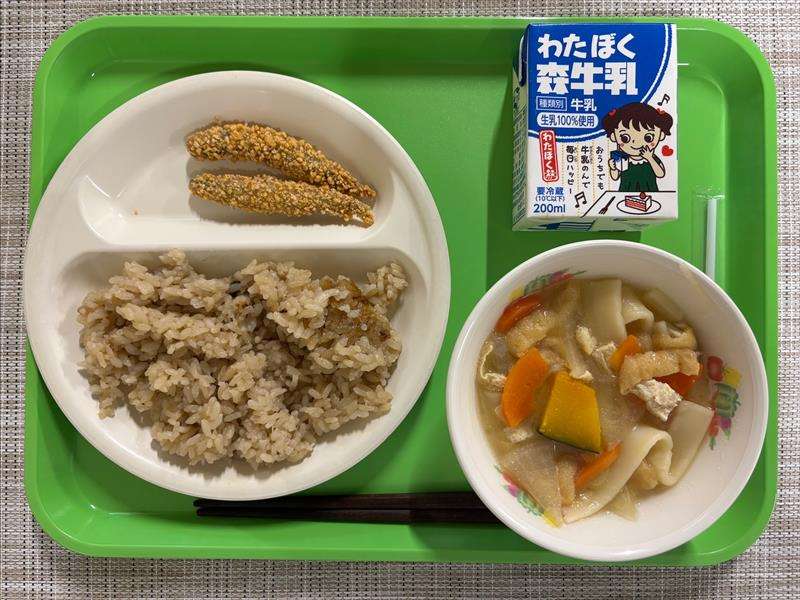 【今日の献立】 ちゃめし・きびなごカリカリフライ・かぼちゃのほうとう・牛乳