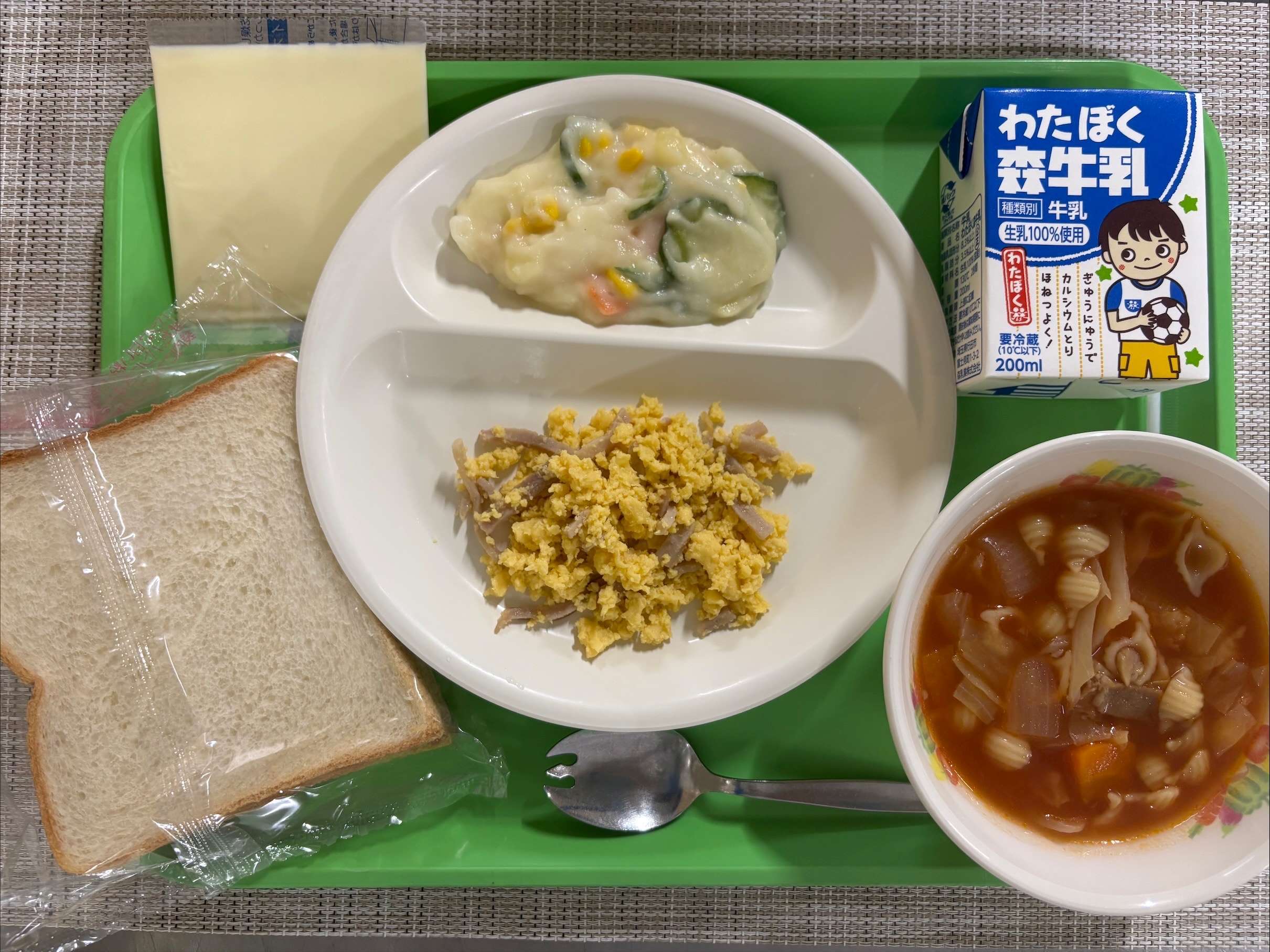 【今日の献立】 食パン・チーズ・いりたまご・ポテトサラダ・ミネストローネ・牛乳