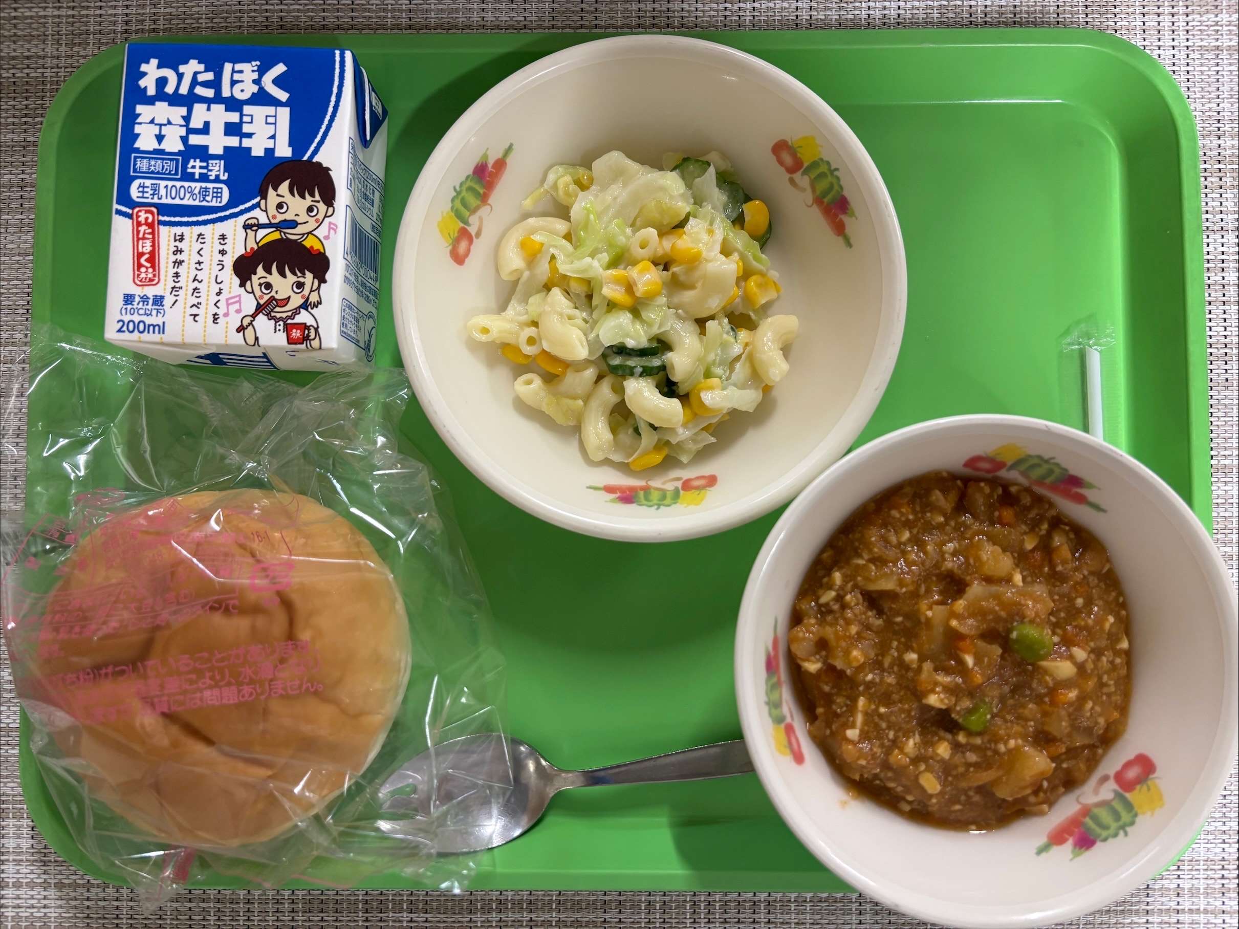 はちみつパン・ポテトのミートソースあえ・マカロニマヨサラダ・牛乳