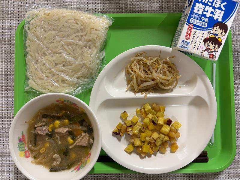 【今日の献立】 スタミナみそラーメン・さつまいもとまめのしおキャラメル・ピりからもやし・牛乳