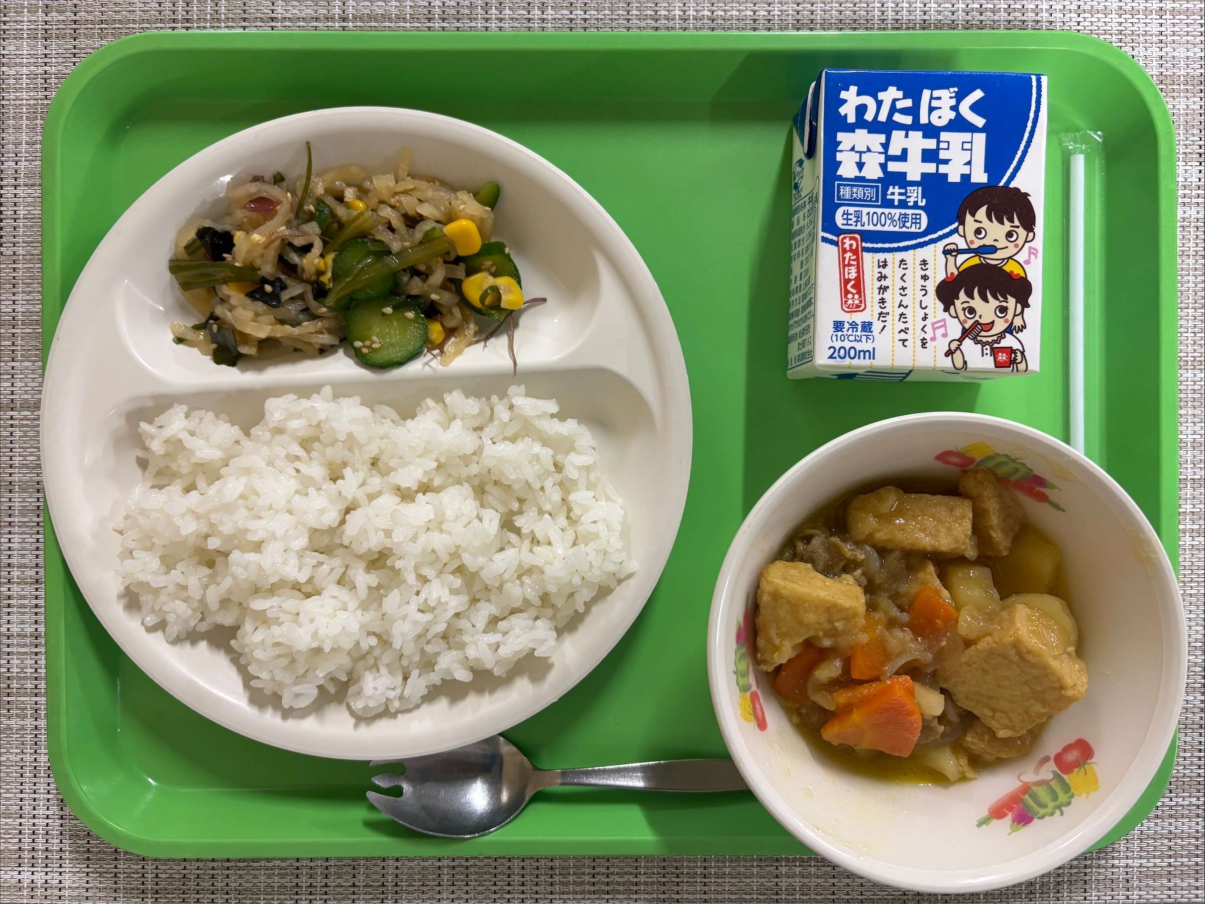【今日の献立】 ごはん・厚揚げのカレー煮・海藻サラダ・牛乳