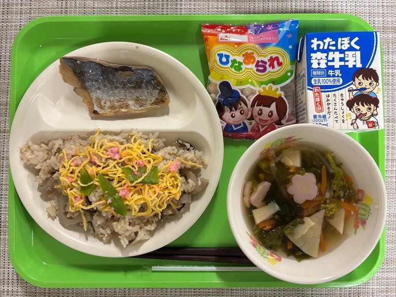 【今日の献立】 ちらし寿司・鰆の西京焼き・菜の花入りすまし汁・ひなあられ・牛乳
