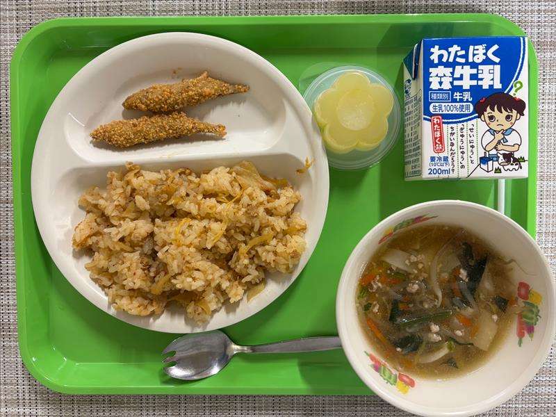 【今日の献立】 キムタクごはん・きびなごカリカリフライ・ワンタンスープ・オレンジゼリー・牛乳