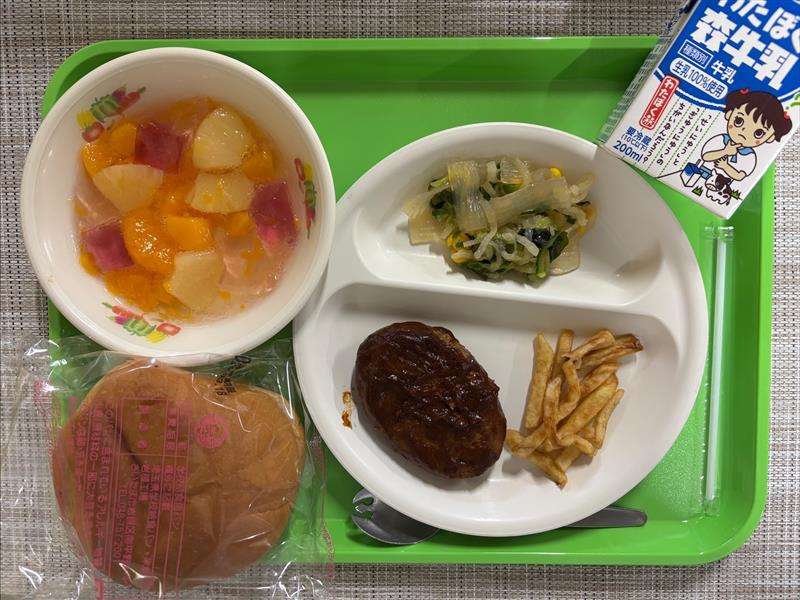 【今日の献立】 ハンバーガー・フライドポテト・こんにゃくサラダ・サイダーポンチ・牛乳